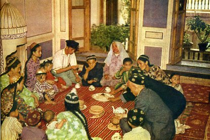 儿媳热必汗?呼达拜地阿杰按照维族习惯在饭前给她祖母洗手。