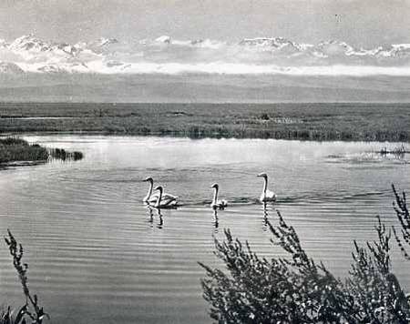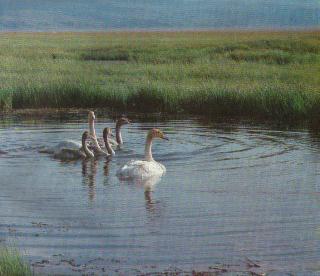 巴音布鲁克草原上的大尤尔都斯湖沼地区,海拔二千五百米,面积约八百多平方公里。这里人烟稀少,气候凉爽,成为天鹅理想的度夏场所,是天鹅大量栖息、繁衍的地方。天鹅所以年复一年地按期在巴音布鲁克定居,除了适宜的自然条件外,就要归功于有爱护鸟类传统美德的当地蒙古族牧民了。他们对天鹅倍加爱护,从不侵犯它们。