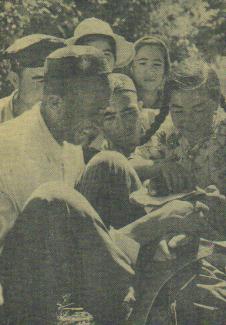 全国先进生产者阿克里木卡衣提,是库尔勒县英下公社其即巴克大队的一个勤劳朴实的社员。几年来,他在党的教育下,为建设幸福美好的社会主义新农村,作出了出色的成绩。阿克里木卡衣提的工分在全队最高,这是社员们在看他的工分手册。(1961年)