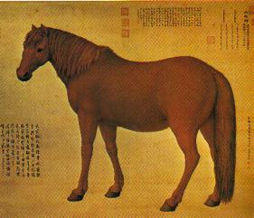 《红玉座》(清)郎世宁绘 台北故宫博物院藏。红玉座为准噶尔台吉进贡乾隆皇帝的骏马。台吉是清皇朝给蒙古外藩的封号。