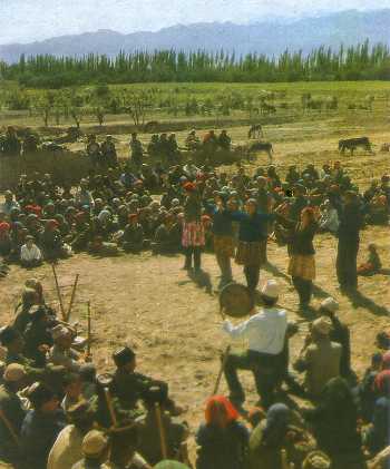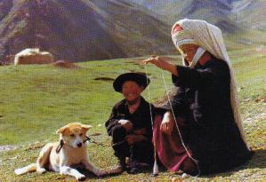 柯尔克孜族牧区妇女和儿童。柯尔克孜族牧区妇女的大包头极有特色,尤其是新娘的包头。用绣花帕层层缠绕并佩戴金银、珠宝、珊瑚等华丽头饰,十分漂亮。