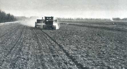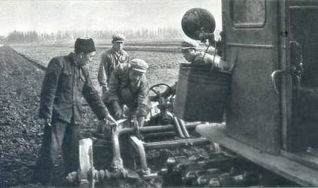 大队支部副书记玉素甫?阿不都拉(左一)和拖拉机手们商议改进耕作质量。