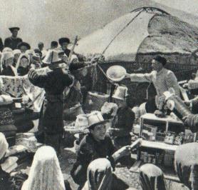 位于帕米尔高原上的阿克陶县,有一支终年活跃在海拔四千米以上高山地区的商业队伍—布龙口供销社。这个供销社有十二个人,负责供应四千平方公里以内的牧民所需的日用品。图为供销社的骆驼队来到布龙口公社恰克拉大队,给牧民们送来了多种日用品。(1965年)