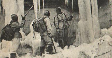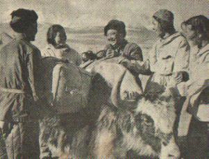 这支登山队的队员有来自祖国各地的大学生、农场工人和医生。她们中间参加登山活动时间最长的也不过三年。在征服公格尔九别峰的过程中,表现出高度的集体主义和顽强勇敢的精神,终于又登上了一个更高的山峰。图为她们在4,900高度观察冰川的岩石。(1961年)