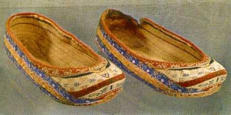 解放后,在吐鲁番出土了大批古代文物。这是东晋时代(公元三一七——四一九年)的锦鞋。