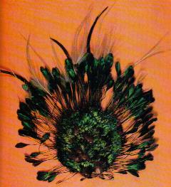 维吾尔族贵妇的孔雀翎。这是用孔雀翎制作的圆形帽花。过去,南疆贵妇和富有妇女喜欢将其戴在花帽上。