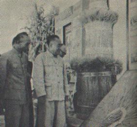朱德副主席视察乌拉乌苏垦区奎屯农场,参观了该场的农业技术革新展览馆。这是他在观看展出的一株“小麦王”。(1958年)