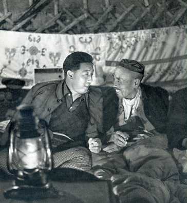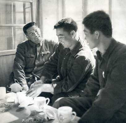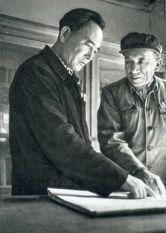 县革委会主任栗寿山(左,汉族)经常深入群众,深入实际。这是他和一位老牧农促膝谈心。