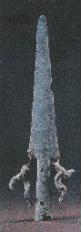 吊人铜矛。晋宁石寨山滇人墓出土。在矛叶下侧,左右各用链条悬挂一个反绑双手的裸体人像。矛长30.5厘米。