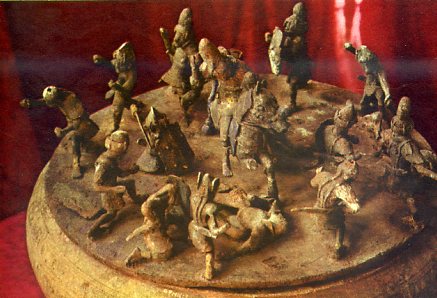 云南省晋宁县石寨山出土的汉代铜器“战争盖贮贝器”。在30公分直径的铜盖上塑有十几名武士,生动地刻划出当时战争的情景。