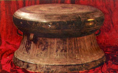 1919年在云南省广南县阿章寨出土的汉代“四船人物大铜鼓”(直径68.5x高47.5cm)。
