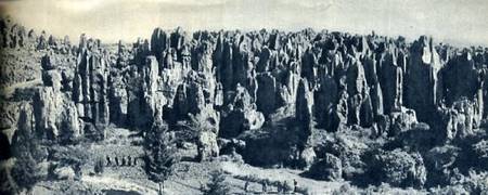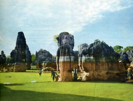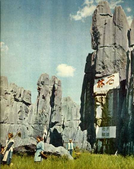 这是石林的“大门”。耸立的岩石上,刻着许多游人的诗词。从岩下经过的,是附近的撒尼族(我国西南少数民族之一)居民。