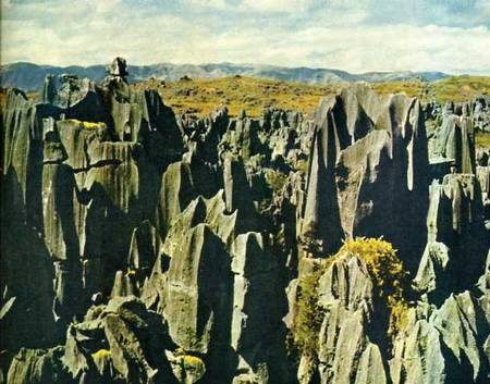 石林在云南省昆明东南100公里,是著名的风景区,附近住着彝支系的撒尼人。