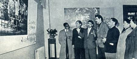 智利画家何塞?万徒勒里最近在古巴创作的《卡米洛?西恩富戈斯》壁画的四十余幅图片,1962年11月17日在我国首都展出,参观的人们对画家创作上的成功和歌颂古巴的热情,表示祝贺和赞扬。这是画家何塞?万徒勒里(左四)和古巴驻中国大使皮诺?桑托斯(左三)、中国拉丁美洲友好协会会长楚图南(左二)等一起参观展览。