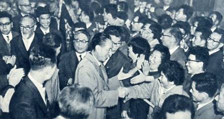 应日本欢迎中国文化友好代表团实行委员会的邀请,中国文化友好代表团在团长楚图南(中)的率领下到日本进行为期一月的友好访问。这是代表团1961年11月20日到达东京时,在机场受到日本各界代表们热烈欢迎的情形。