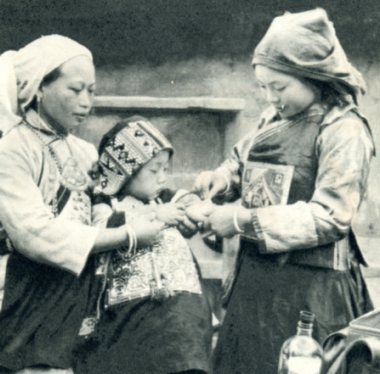 社里的保健员马寿琼给彝族社员的小姑娘种牛豆。