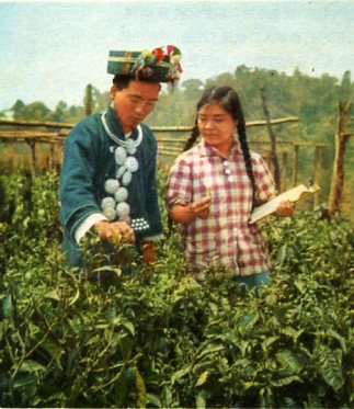 茶叶试验站的工作人员徐宏宾(女)与社员在研究茶叶的生长情况。