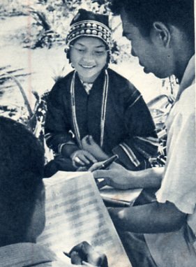 不久前,中央广播事业局、云南省文化局等单位联合组成采集队,分赴云南各少数民族地区采集民歌和民间音乐。图为采集队人员在西双版纳傣族自治州记录哈尼族歌手周桂美唱的民间曲调。