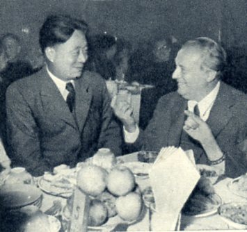 中国诗人艾青(左)和西班牙诗人阿尔见蒂在纪念会上。(1957年)