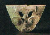 透雕玉饰件。良渚文化(约公元前2900-2000年),瑶山出土。良渚文化遗址在余杭区良渚镇一带。发现于1936年,是新石器时代晚期人类聚居的地方。出土的石器有斧、锛、镰、矛、穿孔斧、穿孔刀等,磨制精致;特别是石犁的使用,说明当时早已进入犁耕阶段。出土的陶器,以泥质灰胎磨光黑皮陶最具特色,采用轮制,器形规则,圈足器居多,用镂孔、竹节纹、弦纹装饰,也有彩绘。玉器发现很多,有璧、琮、璜、坠、环、珠等,大部分出土于墓葬中。