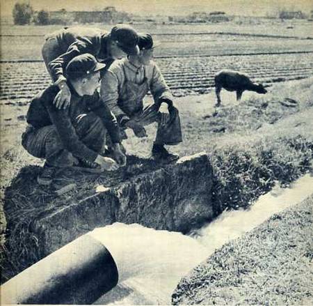 南方水稻地区试办的抽水机站,普遍提高了水稻产量。浙江省长兴县的抽水机站下龙湾埠口的抽水机手,正在试验重新安装后的抽水机,为春耕作准备。