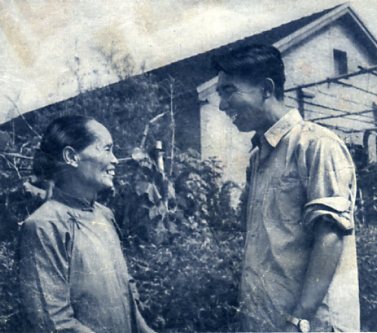 当年游击队员、现在的中共余姚县师范学校支部书记黄全斌前来探望定相大妈。