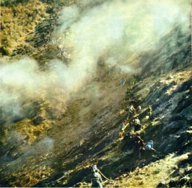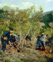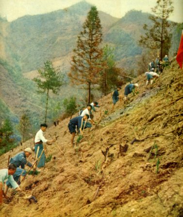 舜山林业生产合作社的社员们在扦插杉苗,使荒山绿化。