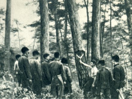 省林业厅的技术人员来指导农民用新法采集松脂。