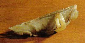 (南宋)白玉荷叶杯。高3厘米,口径9.8至11.5厘米。1974年衢州市王家乡瓜园村史绳祖墓出土。俯视呈两片张开的荷叶,大叶为杯身,小叶覆盖把柄。大叶背面雕有盛开的荷花和荷叶。镂雕卷曲的茎为杯足和把。设计巧妙,造型生动,是件珍贵的艺术品。