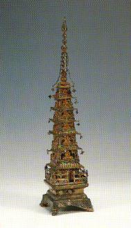 鎏金銀塔。高34.8厘米,慧光塔出土。1966年-1967年在瑞安仙岩慧光塔塔基和塔身內发现60件北宋遗物,其中以庆历二年(公元1042年)描金堆漆舍利函和景佑二年(公元1035年)鎏金银塔最为重要。银塔四面七层,银片鎏刻佛像,每层皆有栏杆和角铃,极为精细。