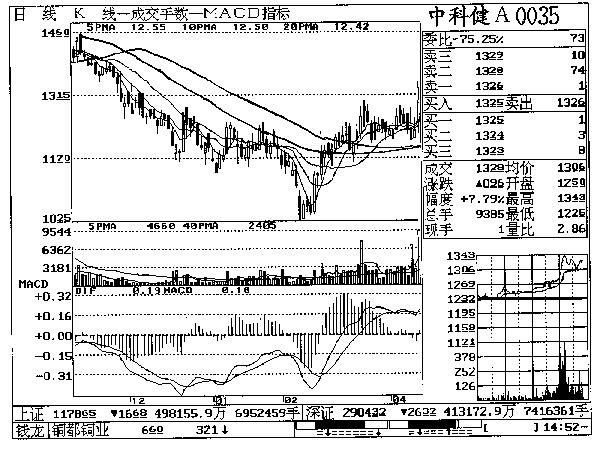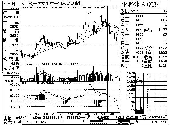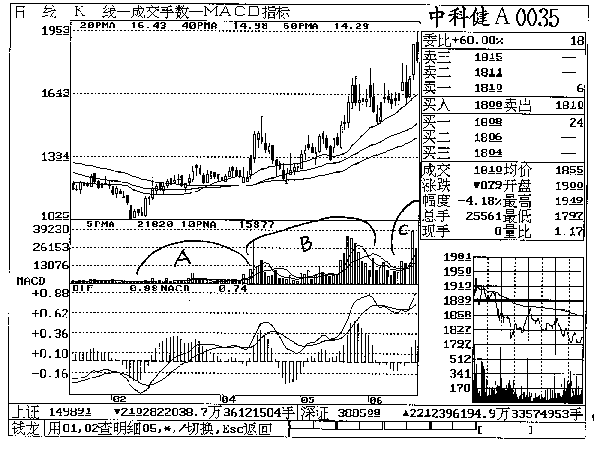 这一次深成指的下跌已是在劫难逃啊!由此可见中科健的走势和深成指的走势正好相反,一个由底部向上涨,一个由顶部向下跌。 史:根据老师的经验,我觉得可以把深成指的指数图制成透明胶片,反过来看正好等于中科健的上升走势。因此,每当指数筑头的时候我们只要准备好透明胶片就行了。用这种胶片反过来看,然后对照个股找黑马,这中科健肯定是符合标准的。 李:我的学生真聪明,以后你就多准备一些透明胶片,整天给我找黑马吧!但指数还有一波强劲的下跌,因此中科健还可能有一个回档。我劝你们用分批分量建仓的方法多选几个点买入,尽量降低成本。 史:我学过老师的【破季托后买入】,其中讲到用5日、10日均线的第一个黄金交叉点买入,以及用60分钟K线图买入。据我观察用30分钟K线图,在量竭尽的时候,一遇到30分钟K线托时就买入,这样股价是很低的,买入的时间也比较集中。不知道对不对? 李:对呀,对呀,我就是用这个办法。你怎么知道的?你以后到我身边来,我再教你用【15分钟K线抄底法】,那才是最低买入区间。 史:(99/06/18 16:38分)今天的中科健创新高后跌了下来,成交量比较大,收盘在18.10元。我们从12.40元买入,至今已有5.70元的增值,有些人已经沉不住气了,怕在这里筑头,想问一下您老,是否应该卖出了?(图0035-3) ![]() |