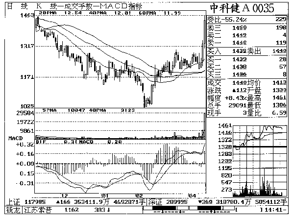 史:这个办法太好记了!盘整带的厚度等于突破后的高度,那么本图的计算公式可以是:13.15元乘以2减去10.25元等于16.05 元,取整数为16元。或者可以记忆为盘整带的顶边线乘以2减去盘整带的底边线等于未来的上升高度。 李:你真是一位有创造性的学生,干脆到我身边来当助手吧!我也不给你发工资了, 凭你的智慧每月的收入就很可观了。 史:(99/04/14)李老师,今天中科健再次放巨量上升,现在已涨了4.83%。前些时候我给家乡的大户讲中科健五条均线方向朝上,呈现多头排列可以买进,可惜他们没买。今天他们来电话想买,可是已经涨到14.40 元了,您说还可以追吗?(图 0035-2) ![]() |