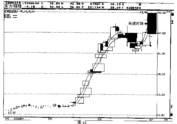 师的一大创造,连西方人都十分敬佩,在这种情况下能不出货吗? 高照明:(99/06/17 16:01分)老胡,我从15分钟OBV能量潮上发现,自东方明珠本轮上升行情以来,第一次出现OBV能量潮跌破趋势线拐头向下,并创新低。这意味着主力正在加大力度出货,是否通知各友邻大户室注意这个问题?(图600832-9) 胡正欣:把这份OBV能量图传真出去,让他们自己考虑下一步行动。 王(990630 收盘后):前几天我们出货后,东方明珠又涨了起来,最高冲到42.98元。 收盘时虽有下跌,但仍然在36.86元。哈尔滨的几个大户室又有人冲进去买入,在37.50元 满仓,据说新的一波上升浪又要开始了。东方明珠将成为中国第一个100元的高价股,您说可能吗?(图600832-10) ![]() 胡:这几天媒介上经常有人鼓吹100元的高价股。有的甚至说不怕套、套不怕、怕不套, 一定要套在东方明珠中。其实这就是股价见顶的表现。今天冲进去满仓的大户,如果是你要好的朋友的话,我劝你让他们警惕,这里是东方明珠的顶部,股价将有一次大跌,我们的很多监控技术都证明了这一点。我让你看一种最简单的技术。压缩图(CNDEPV),压缩图与等量图都是由RichardW.Arma.Jr所提出的,压缩图是于1990年发表,此图是将等量图再还原成同一个时间座标。由此图更容易滤掉一些小成交量的波动,我们只要专注看一些有意义的K线变化就好了。当原来的宽阴线被阳线吃掉表示买进,当原来的宽阳线被阴线吃掉表示卖出。本图配有两条平均线,可设定参数,参数若为零表示不画该线。此平均线的计算方式也是依照Arms先生于同年所提出的计算方式所算出。今天的东方明珠压缩图上显示一块巨大的方块黑线。它显示上升的道路已被封住,股价在此处除了下跌别无选择。在短线培训班把这种巨大的黑方块拦住上升的道路称为【泰山压顶】,最近在很多个股上都出现了【泰山压顶】 的图形,这也许是大盘见顶的预兆。我将在今晚西文中心的讨论会上详细讲解众多个股出现 【泰山压顶】与大盘见顶的关系。最近我将换办公室,以后请拨55570299即可。 |