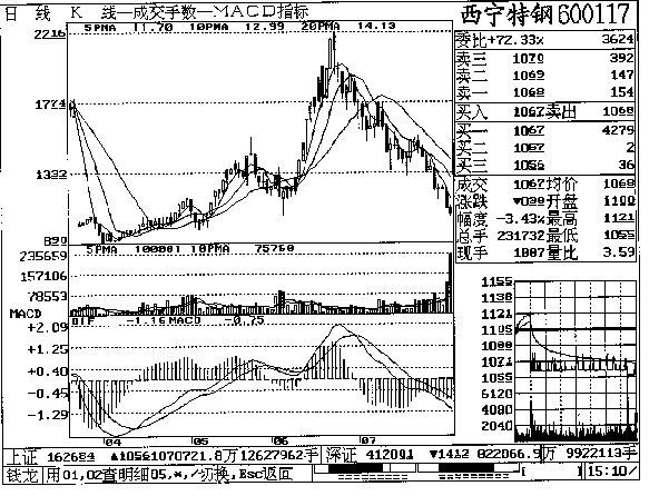 杨(99/08/04 14:20):平小姐,今天上午西宁特钢反弹到11.06元,我想逢高出货,可是每股7元的亏损实在让我割不下去,我想等到下午再出货,可现在跌到10.61元,比昨天又少了0.40元,您看我现在该怎么办?图(600117-3)
