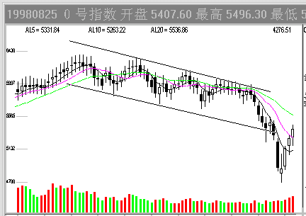 图1.1.4 0号指数的上升压力线被向上突破 这就是说,一个原本已经是不错的牛市行情,出现更牛的上升速率,这种行市当然就是疯牛市。出现疯牛特征意味着上升行情已经到了最后阶段。由物极必反的原理,疯牛市的结果是行情转入暴跌。 与疯牛特征相反的是疯熊特征,当股价向下击穿一个下降的支撑线,市场就成为疯熊市了。就如图1.1.5。