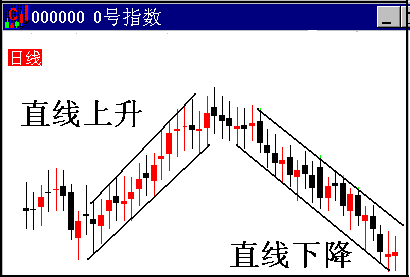 图1.1.3 单边上升通道及单边下降通道 这种直线的单边直线通道的市场含义是多空中的一方取得绝对的优势。一旦这种通道形成,投资者在操作中需严格遵循顺势而为的原则,在直线上升中满仓,在直线下跌中空仓。但股市原理中有这样一句话:多头死了,空头还能活多久?因而这种直线单边通道的持续时间都不会太长。 |