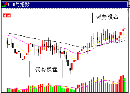 图1.1.6 0号指数的圆弧顶与圆弧底,V形底 股理云,牛市看底,熊市看顶。如果从圆弧顶、圆弧底,V型底,尖顶的关系中去解释这句话,就是说,如果股市的短线底是圆弧底,而顶是个尖顶,那么股市中线是牛市,这个时候底是清楚的,顶则无法把握。反过来,出现的顶是圆弧顶,底是V形底,则是熊市特征。 图1.1.6的第一个底是个V形底,这个时候市场首先体现的是超跌反弹特征。直到冲高回落后出现圆弧底,中线底部方最终形成。 五、强势横盘及弱势横盘 0号指数有时会进入横盘,横盘就有个未来的突破方向,如能提前预测这个突破方向,则对操作有重要的参考价值。 横盘分两类,一是强势横盘,二是弱势横盘。横盘的强弱是以其在成本均线系统上方横盘,还是在成本均线系统下方横盘来划分。在成本均线上方横盘叫强势横盘,在成本均线系统下方横盘叫弱势横盘。这里我们主要使用34日成本均线,图1.1.7左边的那个横盘是弱势横盘,右边的那个横盘是强势横盘。最终,强势横盘向上突破,弱势横盘向下突破。