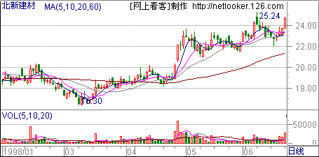 这是北新建材的K线图(见图57)。1998年3月初,我在17.40元买入北新建材,并