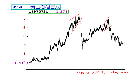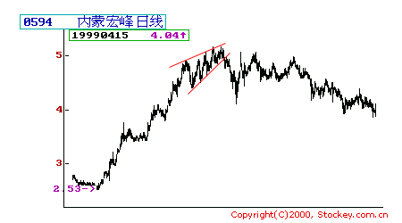 楔形的魅力 一个典型的楔形正如前面文章中附图1中的图e和f。股价在主要趋势上的波动不断收缩, 到最后形成反转,这种形态的出现,表明中场追高意愿逐步消减。稍有卖压,股价反转成了轻而 易举之事。一个典型的例子: 内蒙宏峰(0594)1997年5月之后,股价反复下滑,至年底形成了一个下降楔形, 1998年初放量向上突破。在随后的半年,内蒙宏峰上升了近一倍,大家可以看见,当它向上 突破时,成交量急剧放大(见附图1)。 和其他反转形态一样,向下突破是不需要成交量来支持的。 我们再来看一看见顶的例子。附图2是鲁石化(0554)的走势图,在1996年底,鲁 石化作为一只三线股跟随恶炒低价股潮流迅速赶顶。1996年12月4日,鲁石化见到一个相 当重要的高点,同期指数在12月12日见顶。 (未完待续)