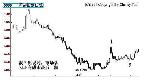 第2浪:它经常把第1浪的升幅吃去大半,以致于在第2浪的终点出现时,市场无利可言
