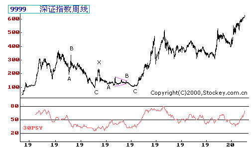 作者:卧龙 艾略特波浪理论新解(八) 人们的注意力总是集中在政治事件上,尤其是毛泽东及邓小平同志担任党和国家重要领导 职务时,街边小报小刊的胡言乱语(非此不能招徕买客)误导了整体文化水平仍然很低的中国 人。直至现在,人们还是把中国股市列为政策市的典型。我想,这些人并未真正理解“股市” 的含义。限于篇幅,我不想花过多的时间在论证上。只要你是辨证唯物主义的追随者,应当知 道“物质决定意识”这个真理。“政策”只是意识,“经济运动”才是物质。94点时政府断 然不会调高证券交易印花税,520点时自然也不会减息,因为基本面的情况决定了政策的方 向。对于业界关于政策市的定性,我只能解释为中国股市正处于大循环浪(Ⅰ)阶段,市场评 论员的整体素质不可能高到哪里去。相信读者自会心中有数。 现代中国经济发展,真正的起步点是1976年。之前,1961年则是另一个低点。在 《老百姓眼中的中国股市》系列文章中,我曾给出一个图,它是中国GDP增长速度曲线图, 很明显,中国经济存在着5年一个小周期及15年一个大周期的循环。1961年之前的19 46年,日本战败,中国最困难的时候也已经过去。但中华人民共和国成立后到1961年, 中国经济仍然没有起色,而1961年恰好就是三年困难时期,这是“大跃进”的后遗症。自 1976年开始,中国经济已经见底并开始回升,如果这个周期维持不变,则1991年15 年后的2006年应当是另一个经济周期的低点。但是,我们注意到自1991年以来,原先 的5年周期现在变成了7年周期。年初我曾经根据国民经济综合景气度走势预测,1998年 6-8月份经济见底,而本周二,《上海证券报》出现了同样的声音。事实上,该课题组的成 员可能花去相当多的时间和精力,但是你只要精通波浪理论,却只需1分钟! 如果小周期由5年变成7年,则大周期就会有两种可能性: 一、两个小周期组成一个大周期,时间跨度仍然是14-15年; 二、仍然是三个小周期组成一个大周期,即大周期时间跨度为21年(神奇数列中的第7 个数),由1991年到2012年。此推测有待日后验证。 经济周期不会一成不变,波浪理论高明之处在于其足够的宽容度,不会把价格变动限定在 一个一维空间内。深圳股市1991年9月份见45点后启动,基本上是晚于经济周期的低点 。限于条件,我们只能对循环浪Ⅰ以后的综合指数进行划分。对于循环浪Ⅱ的划分,我的看法 是1993年2月的368点至1996年1月的105点(并非104点)。整个循环浪Ⅱ 历时34个月(神奇数列第8个数)。最大跌幅高达71。7%。浪Ⅱ的具体划分,至今仍然 未有统一意见,但双重三是大多数人容易接受的(图1): A浪:368-194点; B浪:194-334点; C浪:334-94点; X浪:94-234点; A浪:234-122点; B浪:122-146点; C浪:146-105点; 前面我们提到,A浪的特征是市场大众仍然认为这是牛市中一个正常的回调。翻开当时的 杂志,评论文章基本上是看好者居多,甚至有些文章的言论让人感觉到不是在评论走势,而是 从怂恿投资者入市。结果,市场从368点一路下跌至194点。期间,“牛派”不断降低预 期,到接近底部时干脆不对走势作预测(已失去信心),转而“王顾左右而言他”,却只对政 策作出剖析。 当这些人感到前路茫茫时,深指却展开B浪反弹。三周内速战速决。我想让大家感受一下 什么叫“心态上的放纵”。在334点见顶的前几天,一位朋友想卖掉摩托车然后携资入市, 但因与对方谈不拢,对方嫌其开价太高,而这位朋友又不愿减价,结果捱到334点见顶当日 早上,受不住股市火爆的引诱,索性低价抛掉摩托车,然后在330点时递给输单小姐一张买 入委托单……。证券部人气鼎盛,连玻璃都给挤烂了。 334点之后,可怕的C浪出现了,对此,我记忆犹新!C浪以清晰的5浪下跌。“广东 概念股”热潮及大股东增持深发展的股份仅仅是其中的两次反弹,是为浪2及浪4。当指数跌 破100点时,市场开始变得绝望。 波浪理论这样解释双重三波的出现:当市场一组典型的三浪修正运行完毕之后,基本面仍 然没有好转,甚至继续恶化,在这种情况下由于原先市场跌幅较大,使得指数无法再继续以推 动浪的形式继续下跌,只得以三波形式反弹之后继续横向整理,以等待经济春天的到来。19 94年7月底,政府“三大救市政策”出台。深指历时六周的X浪火热登场,自94点上升至 最高的234点。前面我们指出,X浪最常见的型态是锯齿型,在这里,我们见到了一个再也 正常不过的锯齿型X浪了。 1994-95年,中国通胀曾一度高达27%,长期利率超过10%。在这种情况下, 循环浪Ⅱ的修正也只得继续,尽管有95年“5。18行情”的短暂欢乐,但终究是熊市中的 反弹。在此之前,深指自1994年9月底下跌至1995年4月,已达7个月,当时市场基 于基本面的情况作出悲观的预测。不过,波浪理论的追随者却预感到第二组ABC修正浪的B 浪将快来临。并且有人已预测到B浪将在175点附近结束(翻开1995年5月份的《股市 动态分析》便可找到这种预测)。经过几个月的混战,B浪终于结束。期间长期权证、并购板 块、基金等轮番表演。到最后,循环浪Ⅱ的最后一跌终于来临。1996年1月底,深指结束 了历时3年的循环浪Ⅱ。 回顾1993-95年中国股市,虽然有些细节尚未得到共识,但大体上,它的走势却遵 循着艾略特波浪理论所指的路线前进。无论是申能的“8。18护盘”还是“三大救市政策” ,无论是“T+0”改“T+1”还是“暂停国债期货交易”等基本面的变化,大多是在“技 术的拐点”出现