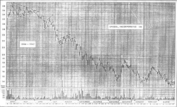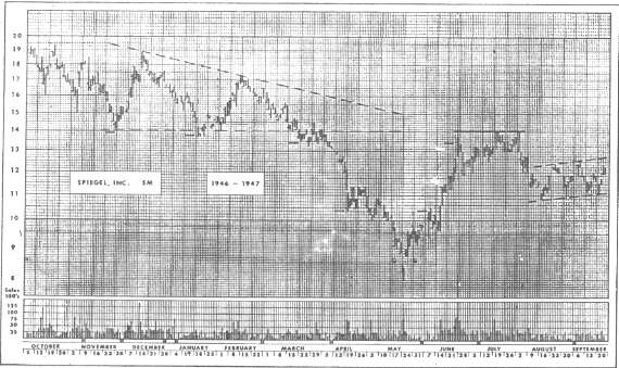 图 183,1946年4月,Spiegel的熊市从对称三角形出发,而该对称三角形则变化成一个下降三角形。注意6月的反扑以及两个旗形。图184为本图的继续。