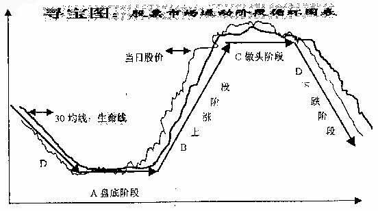 以30日均线为标准,一次完整的股票市场循环运动必然包含上图框定的四个阶段,没有任何一只股票能够例外。30日均线是机构庄家操盘战略战术动作展开的生命线,其中的短线操作价值务必要引起我们绝对高度的重视。要把30均线对股票运动的极其重要性铭刻在我们的骨髓中。只要30日均线线的方向朝下,这只股票就绝对没有产生大行情的物质基础和市场条件,就绝对不是我们展开买进操作动作的目标对象。同时也说明该股票处于第四阶段D下跌阶段。此时正处于庄家战略性波段做空过程之中,行情下跌就是主旋律。间中偶有反弹也是为了更好地出货,这种反弹不抢也罢。处于第二阶段B上涨阶段,庄家战略性拉高的股票那么多,为什么要去抢处于下降通道庄家战略性做空的股票呢?除非整个市场中再也找不到处于30日均线朝上庄家战略性做多的股票,此时才可以考虑用少量资金快进快出短线参与最早反弹的领头羊股只果断抢反弹。