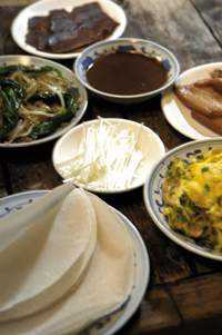 立春日吃春饼称为“咬春”。民间在立春这一天要吃一些春天的新鲜蔬菜,既为防病,又有迎接新春的意味。唐《四时宝镜》记载:"立春,食芦、春饼、生菜,号'菜盘'。"可见唐代人已经开始试春盘、吃春饼了。所谓春饼,又叫荷叶饼,其实是一种烫面薄饼用两小块水面,中间抹油,擀成薄饼,烙熟后可揭成两张。春饼是用来卷菜吃的,菜包括熟菜和炒菜。昔日,吃春饼时讲究到盒子铺去叫“苏盘”(又称盒子菜)。盒子铺就是酱肉铺,店家派人送菜到家。盒子里分格码放熏大肚、松仁小肚、炉肉(一种挂炉烤猪肉)、清酱肉、熏肘子、酱肘子、酱口条、熏鸡、酱鸭等,吃时需改刀切成细丝,另配几种家常炒菜(通常为肉丝炒韭芽、肉丝炒菠菜、醋烹绿豆芽、素炒粉丝,摊鸡蛋等,若有刚上市的“野鸡脖韭菜”炒瘦肉丝,再配以摊鸡蛋,更是鲜香爽口),一起卷进春饼里吃。