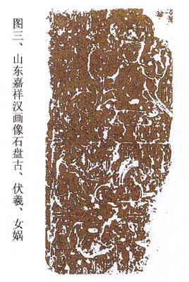3、山东嘉祥一石,朱锡禄《嘉祥汉画像石》图37“伏羲、女娲和车骑画像石”(图3)注“此石早年出土于嘉祥,但具体地点不详。发现后,亦不知归于何处。”“拓本纵72厘米,横38厘米。右面残缺。画面分三层:第一层,中一怪人,左手抱羲牺,右手抱女娲。此怪人一说是盘古,一说是太一。”