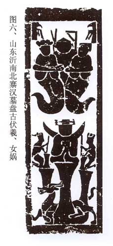 6、山东沂南北寨汉墓画像石(图6),此图被广泛引用。陈履生《神话主神研究》图49附录注:“伏羲、女娲为人首蛇尾,伏羲右侧一矩,女娲右侧一规,后一人双臂紧抱伏羲、女娲。”该图上部,伏、女上端各有一只动物,应为乌、兔。下层为西王母,两侧有乌兔捣药。