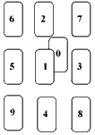 3、接着继续请求问者抽出九张牌。依照图示位置,将选出的牌按顺序放在(1)到(9)的位置。但是,这九张牌都不能先翻开。(1)位置的牌要盖过刚刚先掀开在(0)的位置的第一张牌。