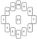 2、再依序取出刚才所拿之牌后面的第一张到第十二张牌,放在图示中(2)到(13)的位置。
