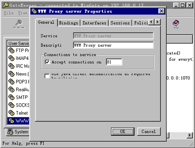 | ☆7、在局域网中怎样使大家共享一个MODEM上网? 要实现大家使用一个MODEM的上网,需要在安装MODEM的电脑上安装一个代理服务器的软件,比较流行的是WinGate,这台电脑我们通常都把它叫做PROXY,网络中的其他机器需要安装TCP/IP协议,并分别设置上IP(如果不设置IP地址的话,就需要在PROXY上将WinGate的DHCP服务打开)。然后在浏览器中再设置代理服务器的IP和WWW服务的端口即可。具体的使用可以参看前面“网络与通信”部分的“在Windows98下拨号上网”中关于PROXY的介绍。 ☆8、安装了WinGate做为代理服务器后,网络内的其它电脑为何还不能够上网。 已经将电脑连接成了一个局域网络,并且给每台电脑都安装了Windows 98,包括TCP/IP协议,在拨号的电脑上已经安装了WINGATE,当拨了号后,其它的电脑却不能上网,只有作为代理服务器的电脑可以。出现这种情况,我们可以按照下面的步骤来检查一下。 首先要确认网络是否畅通:在“网上邻居”中查看是否可以找到其他的电脑。 如果网络正常就需要在代理服务器这端检查是否已经启动了代理服务器软件,只要在Wingate的程序组中再次运行“Start Wingate Engin”即可。 检查网关是否已经拨号上网了 如果检查无误后仍不能上网,可以按下面的步骤设置: 在代理服务器上: 打开“Wingate Keeper” 选择右边的“Services”,打开“WWW Proxy Server ”。更改“Accept connections on”的值(默认的是80): 改为81。 点“OK”。 选择右边的“Services”, 打开“FTP Proxy Server ”。更改“Accept connections on”的值(默认的是21): 改为220。 点“OK”。 然后在重新设置客户端浏览器的代理设置中的端口值: http: 81 FTP: 220 通常是由于HTTP端口的问题导致其他的电脑不能上网,只要多试一下除标准端口值外的其他端口,就可以上网了。 |