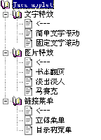 <param name="MenuText00" value="Java applet"> <param name="MenuLink00" value="1"> <param name="MenuText10" value="<---"> <param name="MenuLink10" value="0"> <param name="MenuText11" value="文字特效"> <param name="MenuLink11" value="2"> <param name="MenuText20" value="<---"> <param name="MenuLink20" value="1"> <param name="MenuText21" value="简单文字滚动"> <param name="MenuUrl21" value="../txtscroll/txtscroll.htm"> <param name="MenuTarget21" value="_blank"> <param name="MenuText22" value="固定文字滚动"> <param name="MenuUrl22" value="../solidscr/solidscr.htm"> <param name="MenuTarget22" value="_blank"> <param name="MenuText12" value="图片特效"> <param name="MenuLink12" value="3"> <param name="MenuText30" value="<---"> <param name="MenuLink30" value="1"> <param name="MenuText31" value="书本翻页"> <param name="MenuUrl31" value="../bookflip/bookflip.htm"> <param name="MenuTarget31" value="_blank"> <param name="MenuText32" value="淡出淡入"> <param name="MenuUrl32" value="../cfade/anfade.htm"> <param name="MenuTarget32" value="_blank"> <param name="MenuText33" value="马赛克"> <param name="MenuUrl33" value="../mosaic/mosaic.htm"> <param name="MenuTarget33" value="_blank"> <param name="MenuText13" value="链接菜单"> <param name="MenuLink13" value="4"> <param name="MenuText40" value="<---"> <param name="MenuLink40" value="1"> <param name="MenuText41" value="立体菜单"> <param name="MenuUrl41" value="../cubemenu/cubemenu.htm"> <param name="MenuTarget41" value="_blank"> <param name="MenuText42" value="目录树菜单"> <param name="MenuUrl42" value="../treemenu/treemenu.htm"> <param name="MenuTarget42" value="_blank"> | 菜单设置: 此applet可最多展示20个子菜单,在每个菜单内可展示任意数量的项目,唯一的限制展示项目的物理空间。 每个项目由一个菜单识别码和一个项目识别码所定义。 例如,00表示菜单为0,项目为0;10表示菜单为1,项目为0;22表示菜单为2,项目为2,以此类推。 如果您需要10个以上的菜单或项目,可使用字符代替数字,例如,0a表示菜单为0,项目为10;ja表示菜单为19,项目为10。此运算法从0开始,因此最大菜单为字母J。 请注解您限制的20个菜单和每个菜单的20个项目(因为项目/菜单识别可於0..9/ a..j的范围内变化)。 每个项目应有一个文字标签"MenuTextXY"和一个链接选项"MenuLinXY"或"MenuUrlXY"。(X用来标示菜单,Y用来标示项目) 文字标签: 文字标签的值可以包含数字或特殊字符,他表示这个链接的名字,和目录名或文件名的作用类似。 注意:如果您使用"<---"作为一个菜单项目的名称,它会被绘制成一个黑色的箭头,这种标记常用于返回上一层目录。 链接选项: 每个菜单项目可以有(或没有)一个链接。 此链接可以有2种类型:MenuLinkXY或MenuUrlXY。 当链接选项是MenuLinkXY时,表明要到下一级菜单,或返回上一级菜单。您只需指定相应的菜单标示名(0,1,2...j)即可从当前菜单转到目标菜单。例如:设置如下 <param name="MenuText00" value="Java applet"> <param name="MenuLink00" value="1"> 您只要点击0菜单中0项目“java applet”,就可以到达菜单1。 注意:您必须为每个菜单指定一个“返回”项目,否则用户不能返回到上一层目录中。 当链接选项是MenuUrlXY时,您可以指定一个//或相关连接文件,程序会在您指定的框架中打开链结页。例如:设置如下 <param name="MenuText41" value="立体菜单"> <param name="MenuUrl41" value="../cubemenu/cubemenu.htm"> <param name="MenuTarget41" value="_blank"> 您只要点击4菜单中1项目“立体菜单”,就会在一个新窗口中打开相应路径中的cubemenu.htm页面了。 如果没有用"MenuUrlXY"指定的目标框架,可使用"regnewframe"和 "regframename"参数指定所有"MenuUrlXY"的目标框架。 再设置菜单是一定要思路清晰,最好是先画一张菜单结构图。下图就是本例子中菜单的结构: |